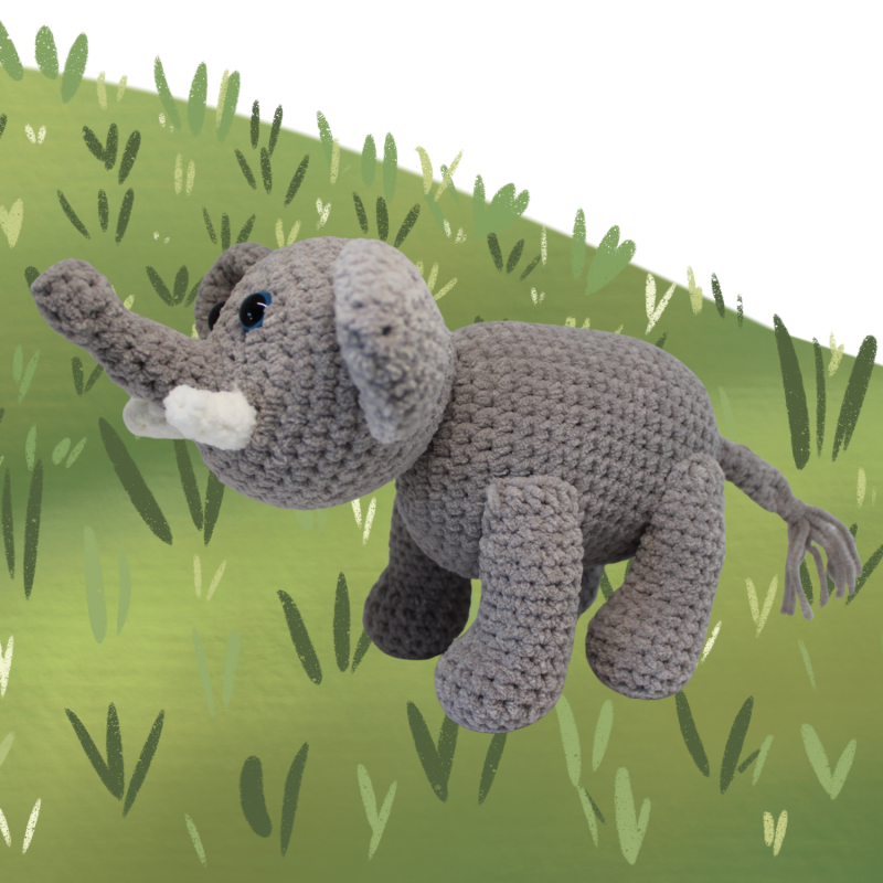 Dit is een afgewerkt product - knuffel van olifant gehaakt met zacht chenillegaren.